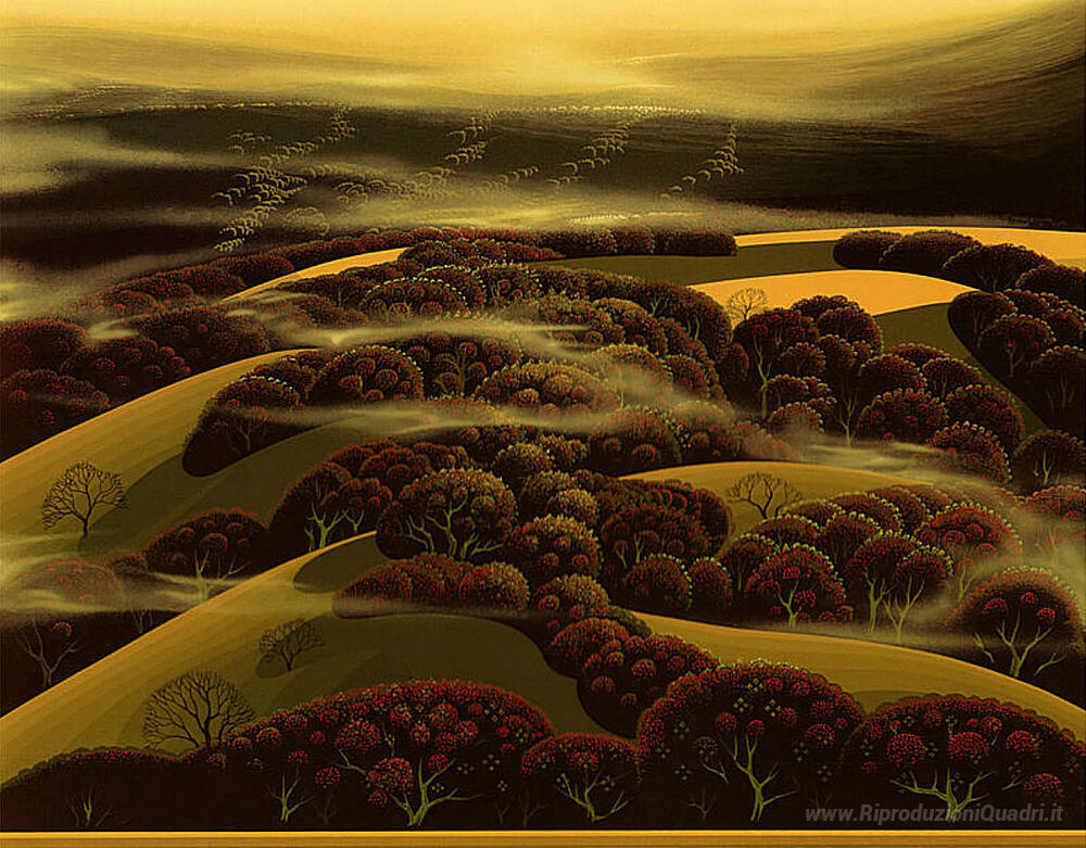Ti offriamo una riproduzione artigianale su tela dell'opera famosa 'Quando la nebbia Rolls dentro' di Eyvind Earle, dal Museo delle Riproduzioni.