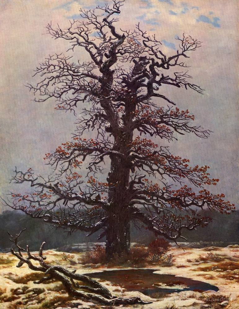 Ti offriamo una riproduzione artigianale su tela dell'opera famosa 'Quercia nella neve' di Caspar David Friedrich, dal Museo delle Riproduzioni.