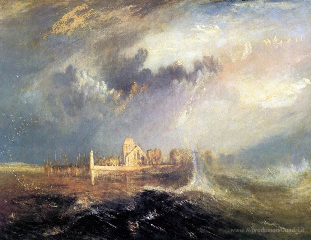 Ti offriamo una riproduzione artigianale su tela dell'opera famosa 'Quillebeuf, alla Bocca di Seine' di William Turner, dal Museo delle Riproduzioni.