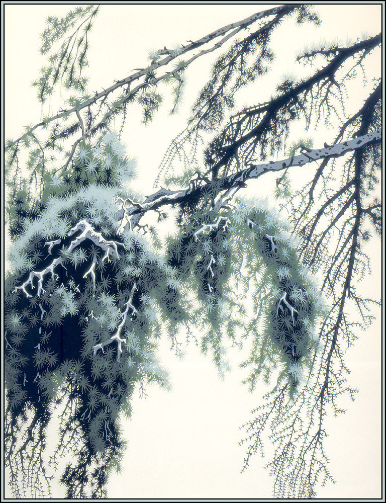 Ti offriamo una riproduzione artigianale su tela dell'opera famosa 'Ramo di pino' di Eyvind Earle, dal Museo delle Riproduzioni.