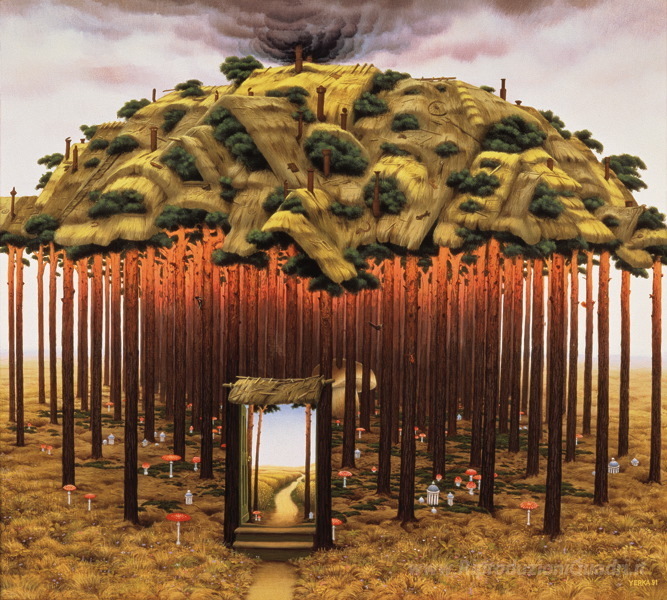 Ti offriamo una riproduzione artigianale su tela dell'opera famosa 'Re Boletus' di Jacek Yerka, dal Museo delle Riproduzioni.