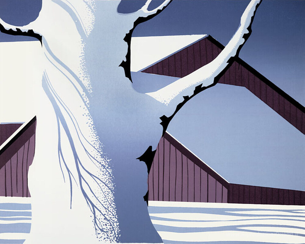 Ti offriamo una riproduzione artigianale su tela dell'opera famosa 'Red Barn e Tronco d'albero' di Eyvind Earle, dal Museo delle Riproduzioni.