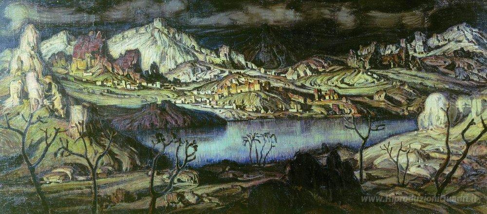 Ti offriamo una riproduzione artigianale su tela dell'opera famosa 'Regione Cimmerian' di Konstantin Bogaevsky, dal Museo delle Riproduzioni.