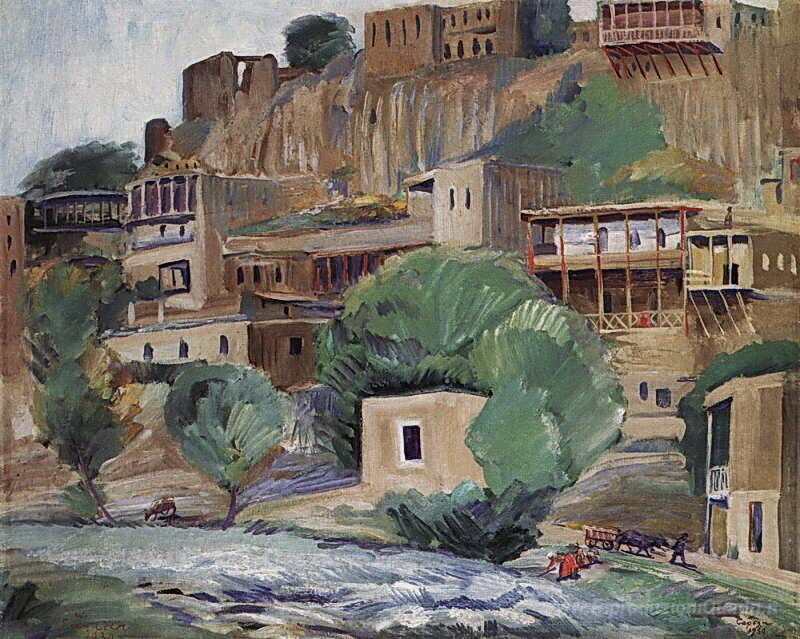 Ti offriamo una riproduzione artigianale su tela dell'opera famosa 'Rive del fiume Zangu vicino a Yerevan' di Martiros Saryan, dal Museo delle Riproduzioni.