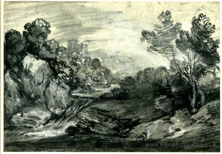 Ti offriamo una riproduzione artigianale su tela dell'opera famosa 'Rocky paesaggio boscoso con cascata, il castello e la montagna,' di Thomas Gainsborough, dal Museo delle Riproduzioni.