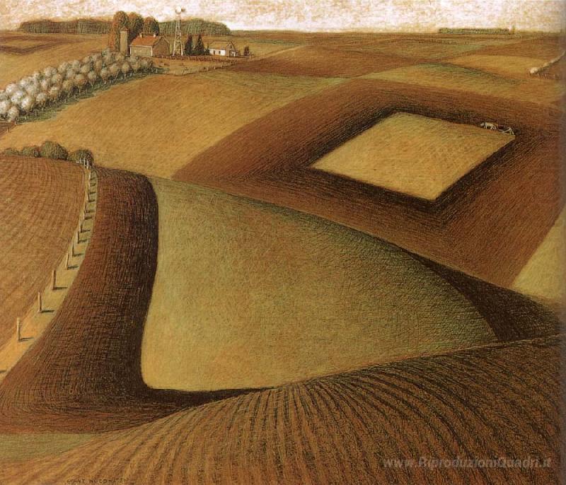 Ti offriamo una riproduzione artigianale su tela dell'opera famosa 'Rompere terra' di Grant Wood, dal Museo delle Riproduzioni.