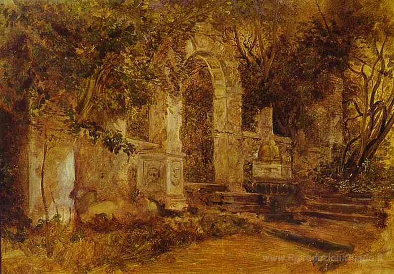 Ti offriamo una riproduzione artigianale su tela dell'opera famosa 'Rovine nel Parco' di Karl Bryullov, dal Museo delle Riproduzioni.