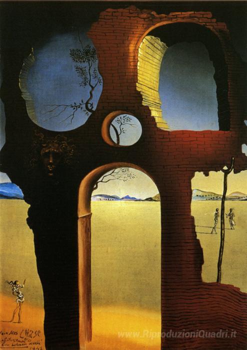 Ti offriamo una riproduzione artigianale su tela dell'opera famosa 'Rudere con testa di Medusa e del paesaggio' di Salvador Dali, dal Museo delle Riproduzioni.