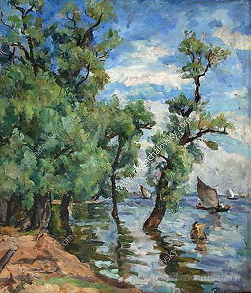 Ti offriamo una riproduzione artigianale su tela dell'opera famosa 'Salici sul Volkhov' di Pyotr Konchalovsky, dal Museo delle Riproduzioni.
