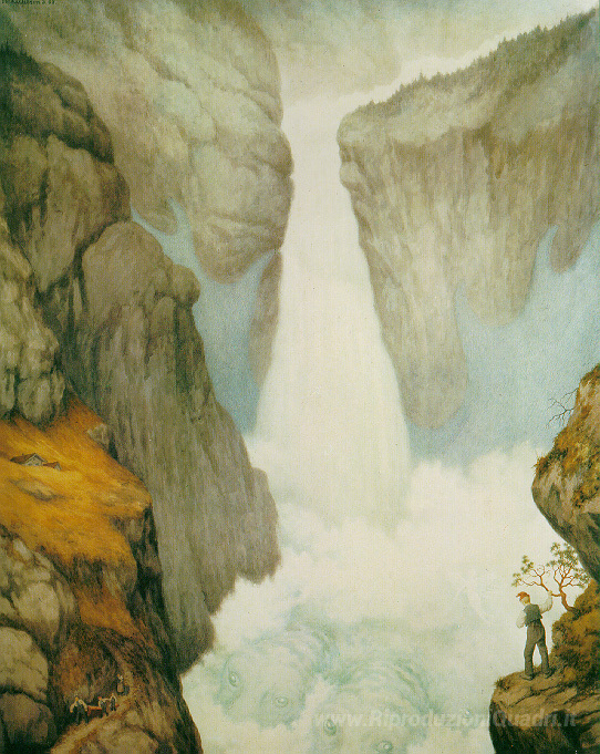 Ti offriamo una riproduzione artigianale su tela dell'opera famosa 'Sam Eyde Foran Svelgfoss' di Theodor Severin Kittelsen, dal Museo delle Riproduzioni.