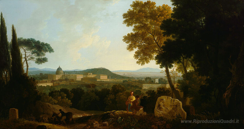 Ti offriamo una riproduzione artigianale su tela dell'opera famosa 'San Pietro e il Vaticano dal Gianicolo, Roma' di Richard Wilson, dal Museo delle Riproduzioni.