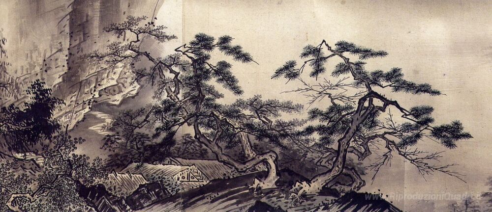 Ti offriamo una riproduzione artigianale su tela dell'opera famosa 'Sansui chokan, dettaglio' di Sesshu Toyo, dal Museo delle Riproduzioni.