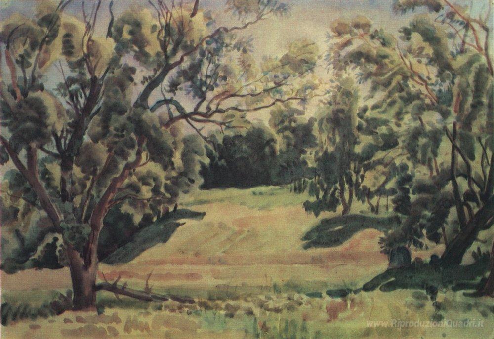 Ti offriamo una riproduzione artigianale su tela dell'opera famosa 'Scena bosco vicino Tarusa' di Konstantin Bogaevsky, dal Museo delle Riproduzioni.