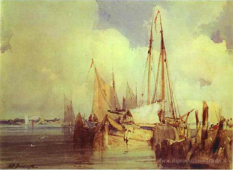 Ti offriamo una riproduzione artigianale su tela dell'opera famosa 'Scena del fiume francese con Fishing Boats' di Richard Parkes Bonington, dal Museo delle Riproduzioni.