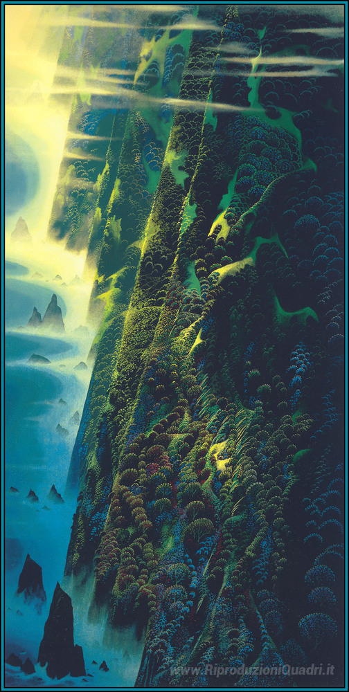 Ti offriamo una riproduzione artigianale su tela dell'opera famosa 'Scogliere Jeweled' di Eyvind Earle, dal Museo delle Riproduzioni.