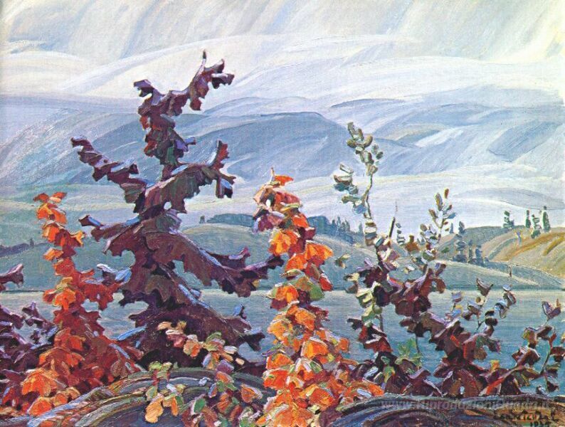 Ti offriamo una riproduzione artigianale su tela dell'opera famosa 'Scrub Oaks e aceri' di Franklin Carmichael, dal Museo delle Riproduzioni.