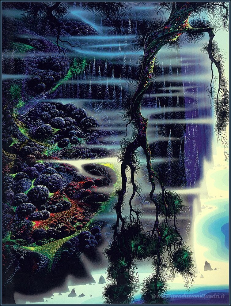 Ti offriamo una riproduzione artigianale su tela dell'opera famosa 'Seaside Splendor' di Eyvind Earle, dal Museo delle Riproduzioni.