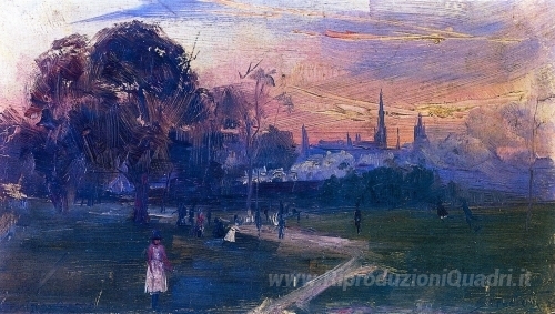 Ti offriamo una riproduzione artigianale su tela dell'opera famosa 'Sera Gioco' di Arthur Streeton, dal Museo delle Riproduzioni.