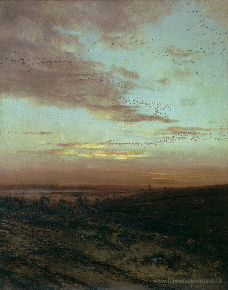 Ti offriamo una riproduzione artigianale su tela dell'opera famosa 'Sera migrazione degli uccelli' di Aleksey Savrasov, dal Museo delle Riproduzioni.