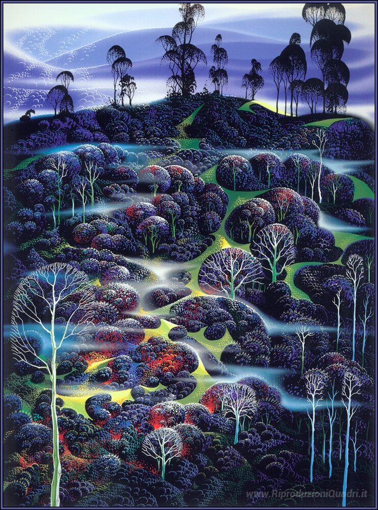 Ti offriamo una riproduzione artigianale su tela dell'opera famosa 'Solitudine Solenne' di Eyvind Earle, dal Museo delle Riproduzioni.