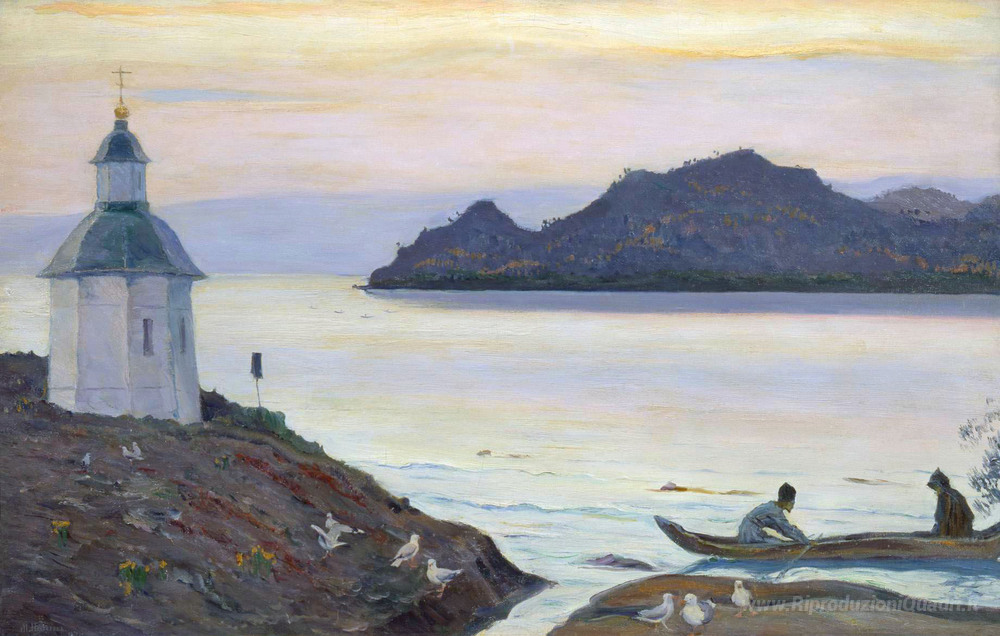 Ti offriamo una riproduzione artigianale su tela dell'opera famosa 'Solovki' di Mikhail Nesterov, dal Museo delle Riproduzioni.