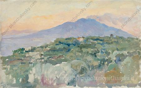 Ti offriamo una riproduzione artigianale su tela dell'opera famosa 'Sorrento. Il Vesuvio sullo sera.' di Pyotr Konchalovsky, dal Museo delle Riproduzioni.