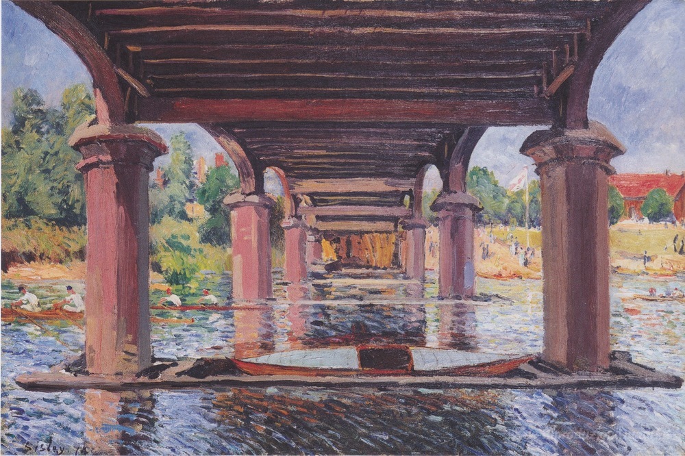 Ti offriamo una riproduzione artigianale su tela dell'opera famosa 'Sotto il ponte di Hampton Court' di Alfred Sisley, dal Museo delle Riproduzioni.