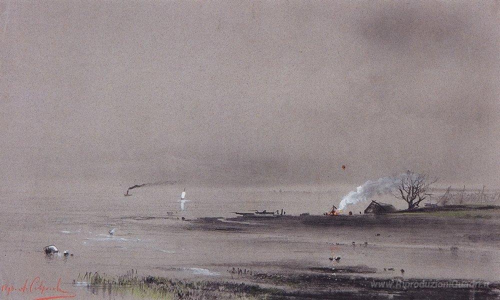 Ti offriamo una riproduzione artigianale su tela dell'opera famosa 'Spassky arretrato sul Volga' di Aleksey Savrasov, dal Museo delle Riproduzioni.