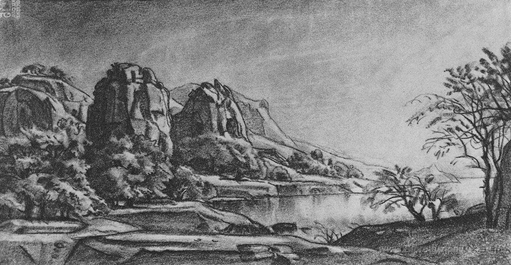 Ti offriamo una riproduzione artigianale su tela dell'opera famosa 'Spiaggia rocciosa' di Konstantin Bogaevsky, dal Museo delle Riproduzioni.