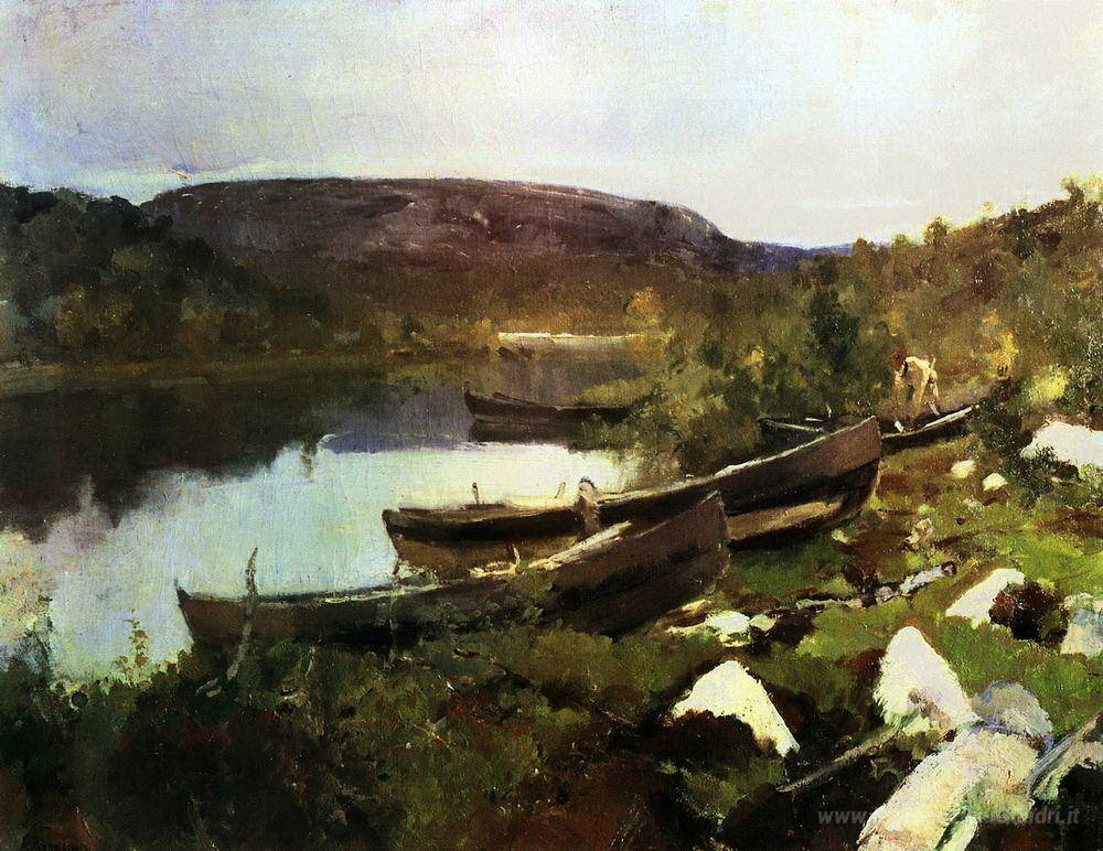 Benvenuti nella sezione dedicata ai magnifici dipinti a olio italiani, dove ogni opera racconta una storia unica e affascinante. Oggi vi presentiamo St. Triphon's Brook in Pechenega, un'opera straordinaria del maestro russo Konstantin Korovin, noto per il suo stile impressionista che cattura la luce e la bellezza della natura. Korovin, uno dei più importanti pittori del suo tempo, unisce una vibrante palette di colori a tecniche di pennellata fluida, creando atmosfere suggestive e contemplative.