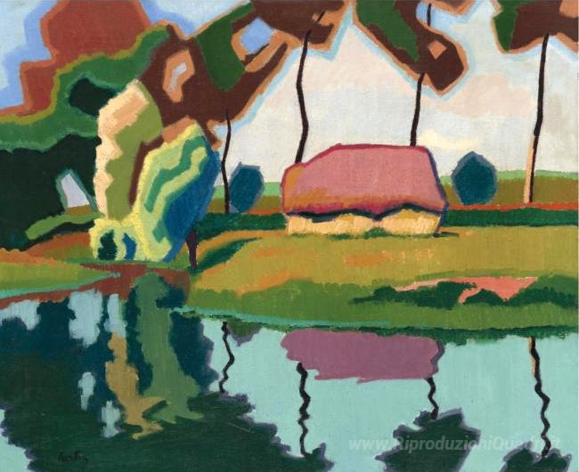 Ti offriamo una riproduzione artigianale su tela dell'opera famosa 'Stagno e Piccola Casa' di Auguste Herbin, dal Museo delle Riproduzioni.