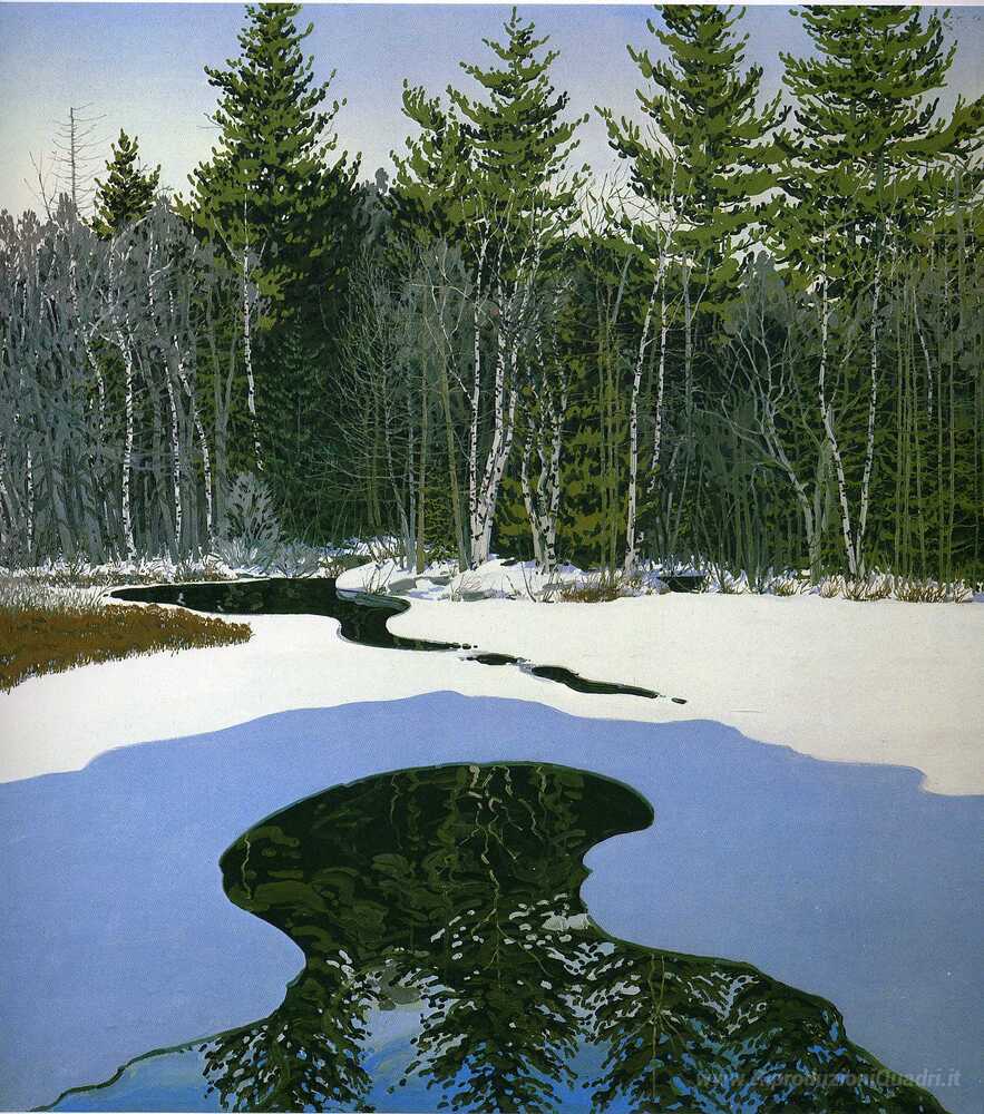 Ti offriamo una riproduzione artigianale su tela dell'opera famosa 'Stagno Passo' di Neil Welliver, dal Museo delle Riproduzioni.