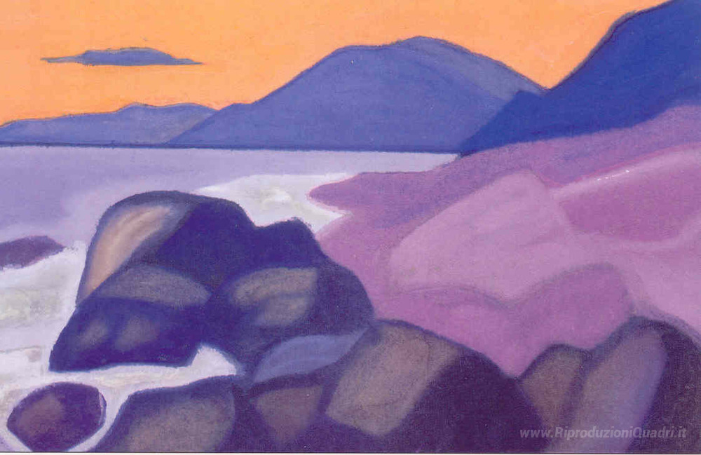 Ti offriamo una riproduzione artigianale su tela dell'opera famosa 'Sul lago Negozio Pangalo' di Nicholas Roerich, dal Museo delle Riproduzioni.