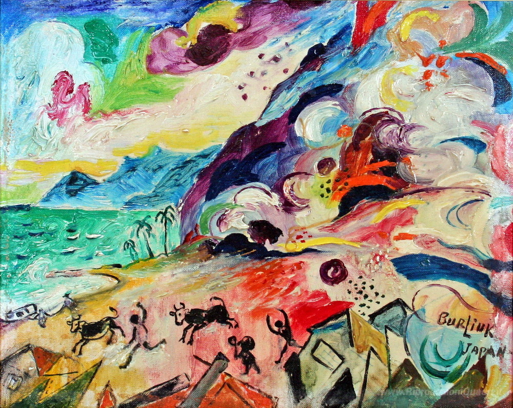 Ti offriamo una riproduzione artigianale su tela dell'opera famosa 'Sulla spiaggia, il Giappone' di David Burliuk, dal Museo delle Riproduzioni.