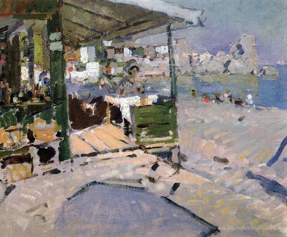 Ti offriamo una riproduzione artigianale su tela dell'opera famosa 'Sulla spiaggia in Crimea' di Konstantin Korovin, dal Museo delle Riproduzioni.