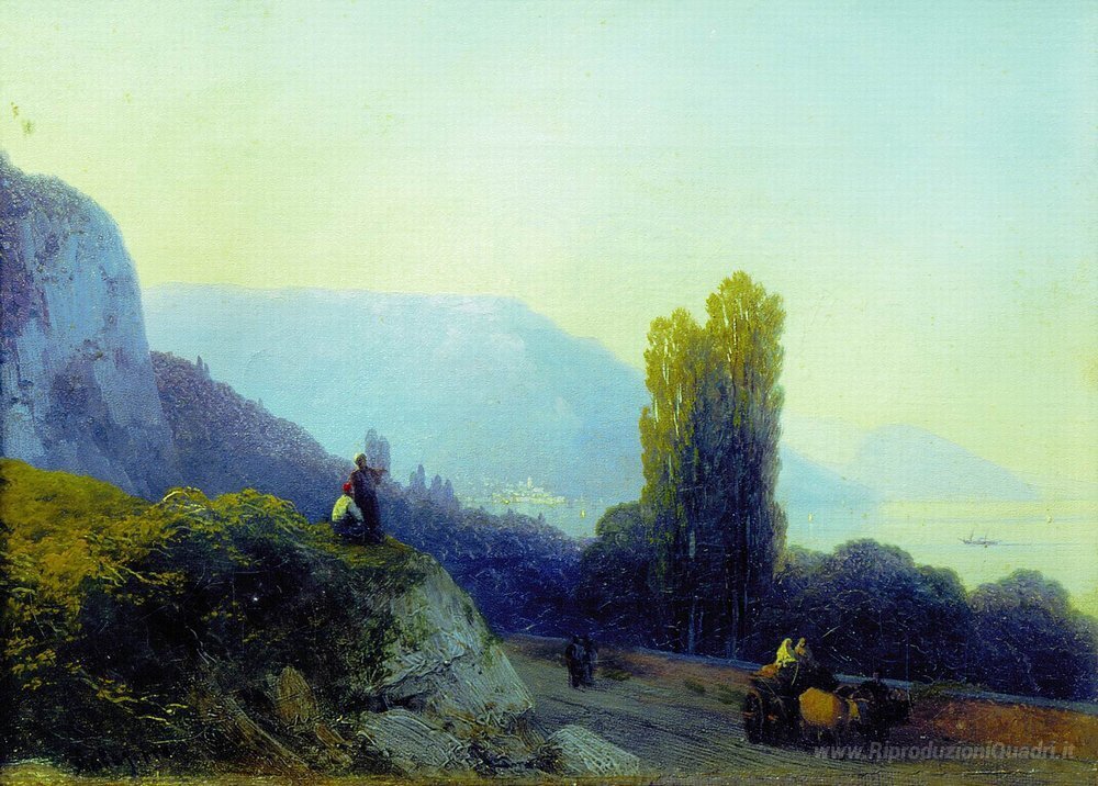 Ti offriamo una riproduzione artigianale su tela dell'opera famosa 'Sulla strada per Yalta' di Ivan Aivazovsky, dal Museo delle Riproduzioni.