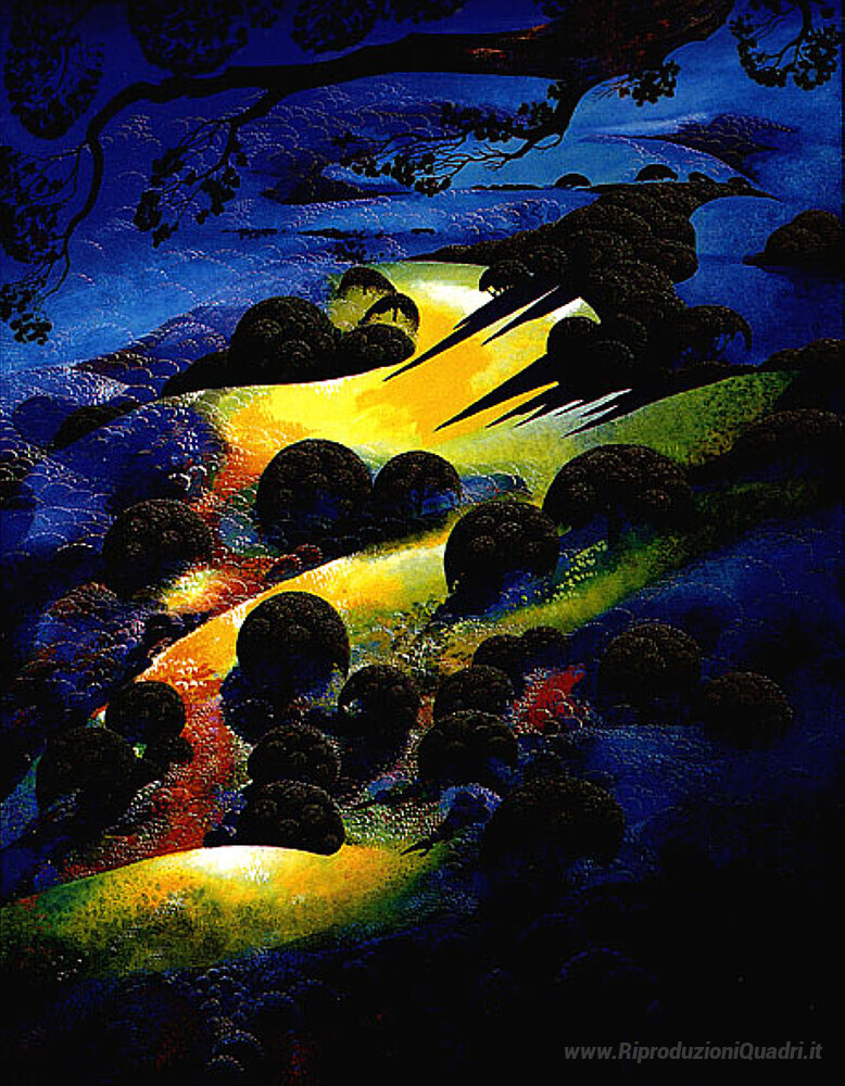 Ti offriamo una riproduzione artigianale su tela dell'opera famosa 'Sunset Fiamma' di Eyvind Earle, dal Museo delle Riproduzioni.