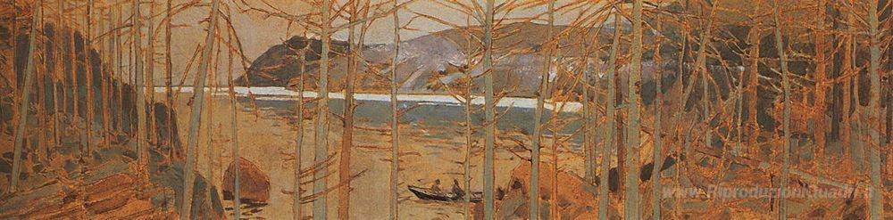 Ti offriamo una riproduzione artigianale su tela dell'opera famosa 'Taiga vicino Baikal' di Konstantin Korovin, dal Museo delle Riproduzioni.