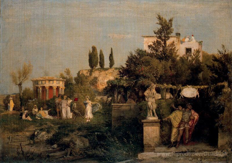 Ti offriamo una riproduzione artigianale su tela dell'opera famosa 'Taverna a Roma' di Arnold Böcklin, dal Museo delle Riproduzioni.
