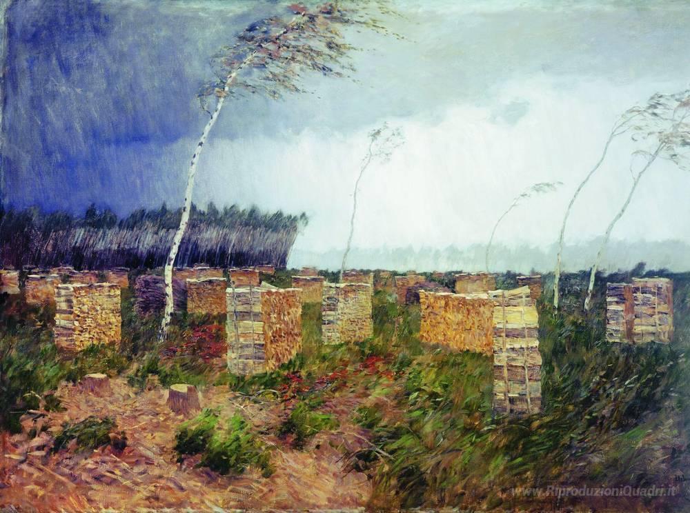 Immergetevi nella bellezza senza tempo del dipinto Tempesta. Pioggia., un capolavoro del celebre artista russo Isaac Levitan. Conosciuto per la sua abilità nel catturare l’essenza della natura, Levitan riesce a trasmettere le emozioni più profonde attraverso le sue opere. La sua tecnica, che unisce tocchi delicati e pennellate vigorose, crea una sinergia tra luce e ombra, evocando una sensazione di movimento e vita nel paesaggio.