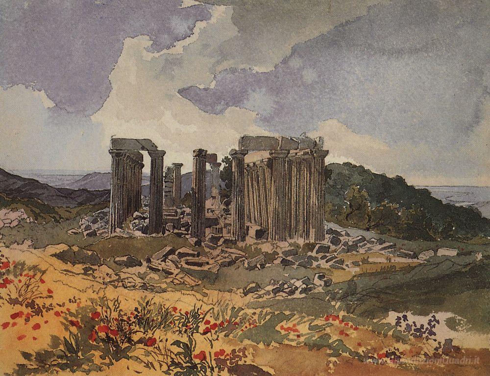 Ti offriamo una riproduzione artigianale su tela dell'opera famosa 'Tempio di Apollo a Phigalia' di Karl Bryullov, dal Museo delle Riproduzioni.
