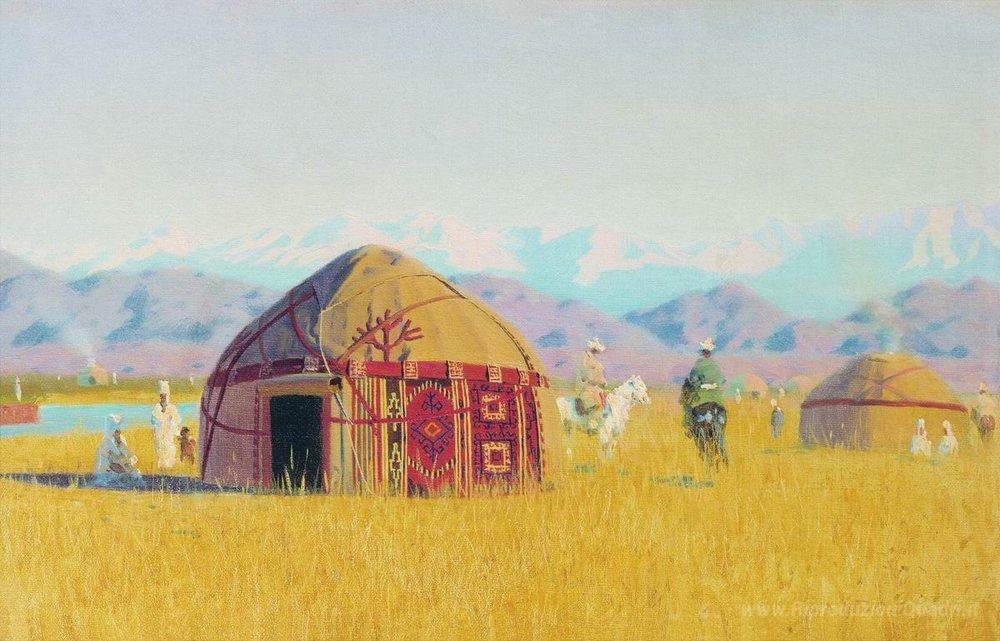 Ti offriamo una riproduzione artigianale su tela dell'opera famosa 'Tenda del Kirghizistan sul fiume Chu' di Vasily Vereshchagin, dal Museo delle Riproduzioni.