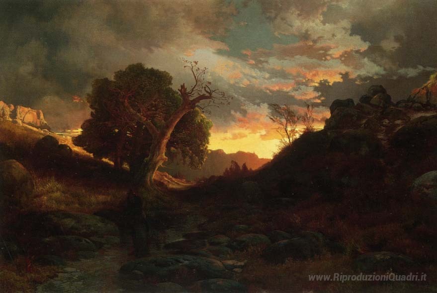 Ti offriamo una riproduzione artigianale su tela dell'opera famosa 'The Evening Hunter' di Thomas Moran, dal Museo delle Riproduzioni.