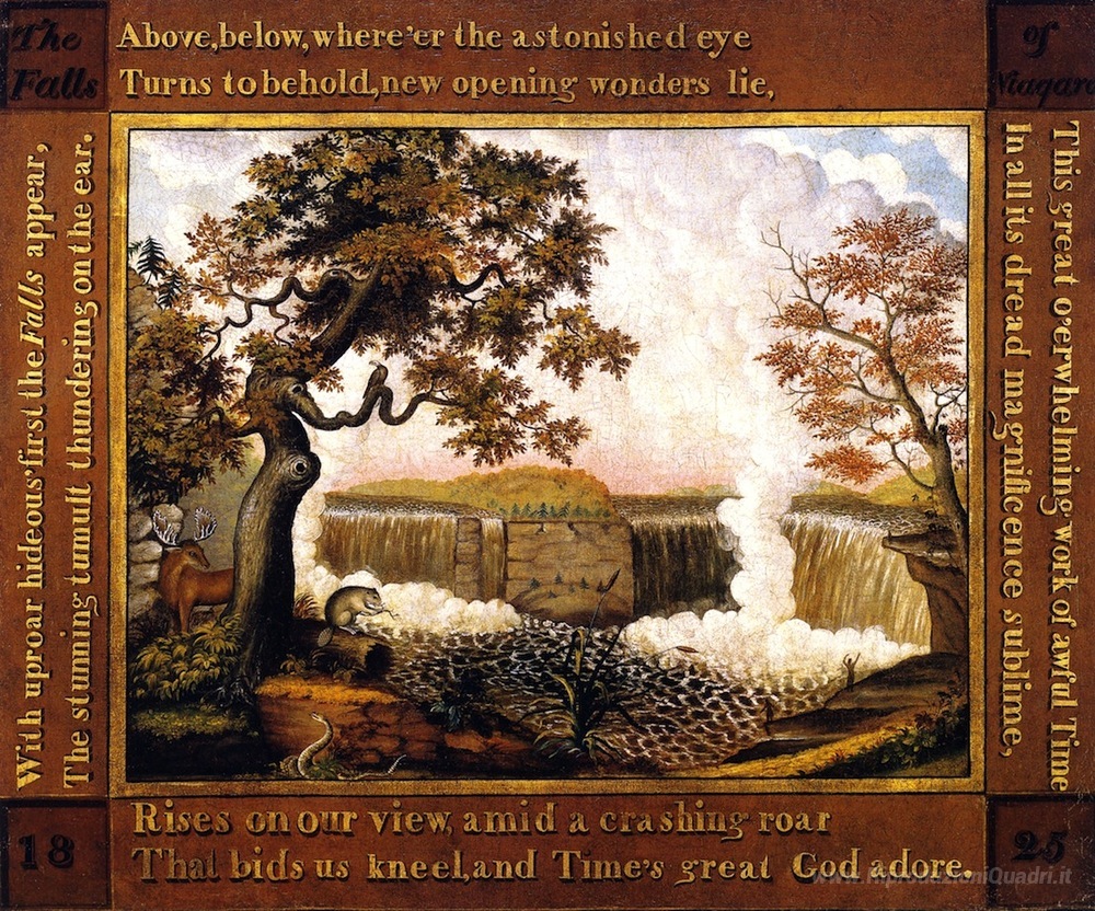 Benvenuti nel nostro esclusivo catalogo di dipinti a olio, dove l'arte italiana incontra la tradizione e la maestria di artisti rinomati. Tra le opere proposte, The Falls of Niagara di Edward Hicks si distingue per la sua straordinaria capacità di catturare la magnificenza della natura attraverso pennellate delicate e vivaci. Edward Hicks, noto per il suo stile unico che fonde realismo e idealismo, crea in questo dipinto un'atmosfera di meraviglia e grandezza che trasporta lo spettatore nel cuore di una delle meraviglie naturali più celebri del mondo.