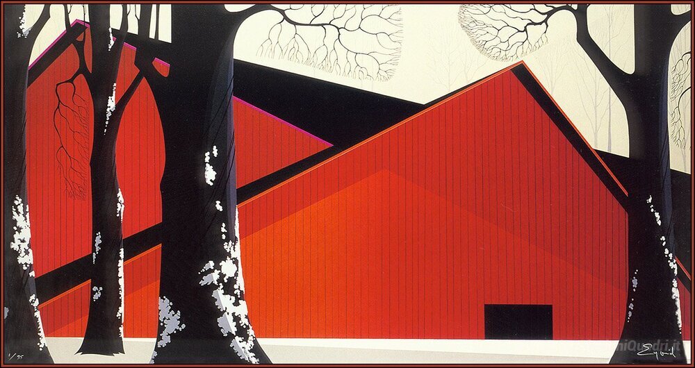 Ti offriamo una riproduzione artigianale su tela dell'opera famosa 'The Great Red Barn' di Eyvind Earle, dal Museo delle Riproduzioni.