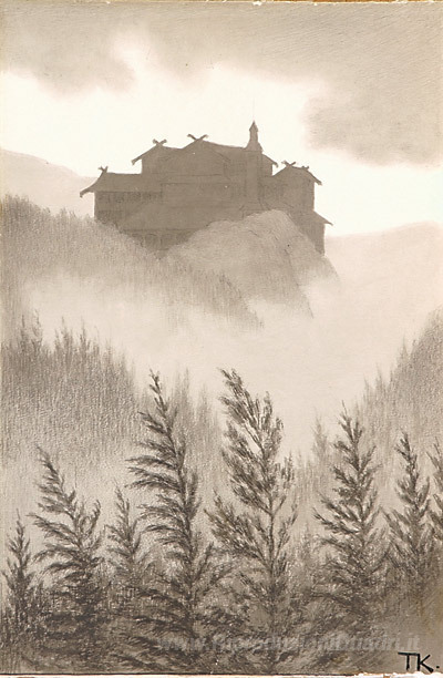Ti offriamo una riproduzione artigianale su tela dell'opera famosa 'Til Den Groenne Ridder' di Theodor Severin Kittelsen, dal Museo delle Riproduzioni.
