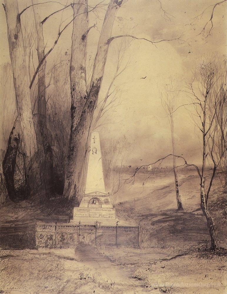 Ti offriamo una riproduzione artigianale su tela dell'opera famosa 'Tomba di Alexander Pushkin nel monastero Svyatogorsky' di Aleksey Savrasov, dal Museo delle Riproduzioni.