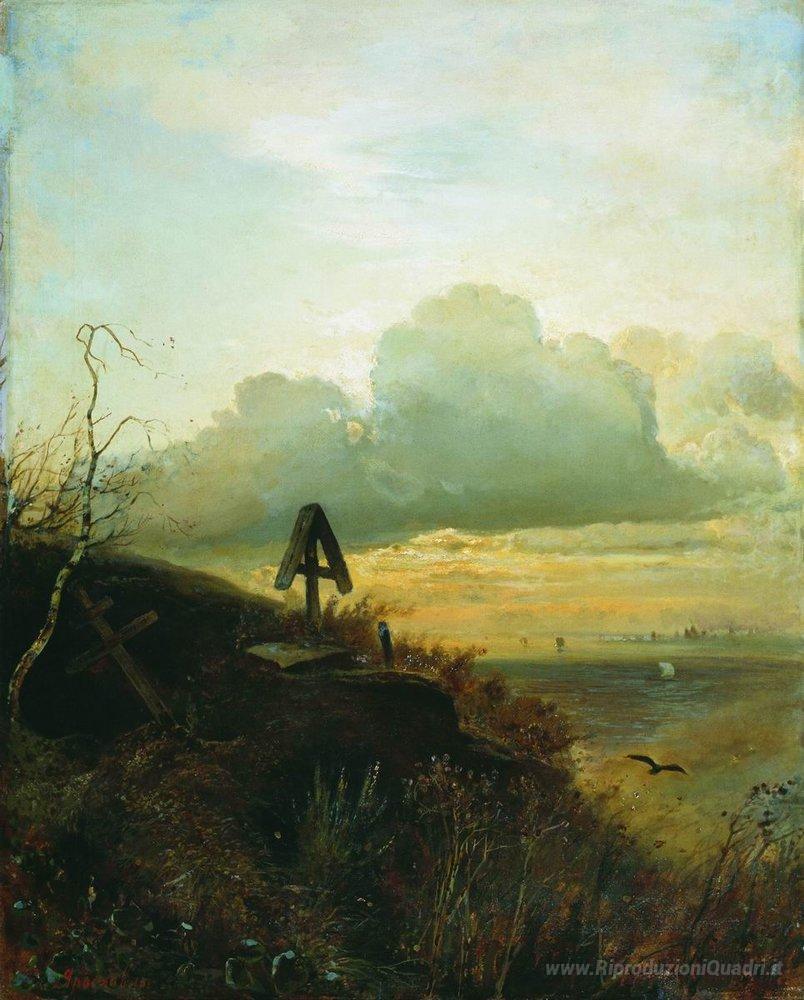 Ti offriamo una riproduzione artigianale su tela dell'opera famosa 'Tomba sulle rive del Volga' di Aleksey Savrasov, dal Museo delle Riproduzioni.
