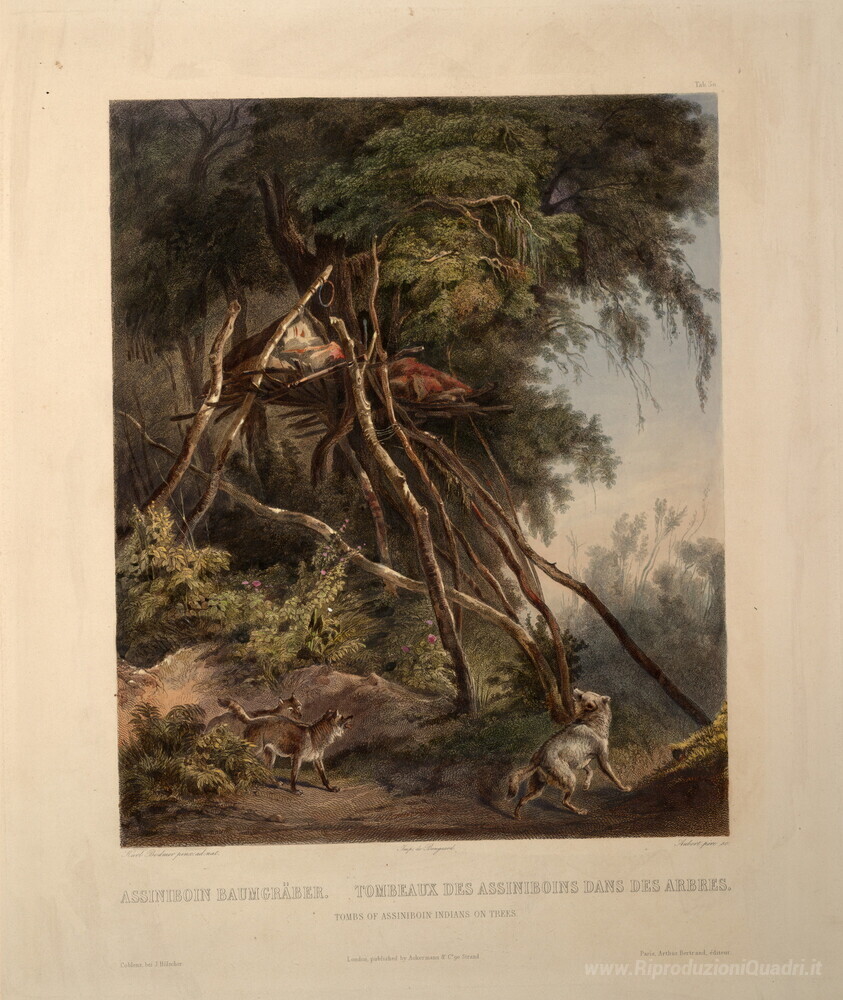 Ti offriamo una riproduzione artigianale su tela dell'opera famosa 'Tombe dei Assiniboin indiani sugli alberi, piatto 30 da volume 1' di Karl Bodmer, dal Museo delle Riproduzioni.