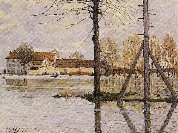 Ti offriamo una riproduzione artigianale su tela dell'opera famosa 'Traghetto per l'Ile de la Loge, Inondazione' di Alfred Sisley, dal Museo delle Riproduzioni.
